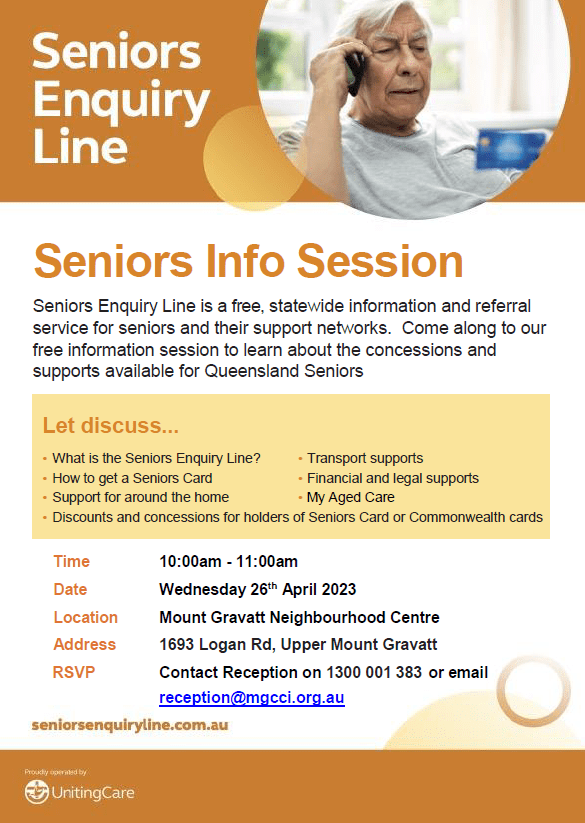 26.04.2023 – Mount Gravatt Neighbourhood Centre – SEL and Supports for Seniors – Event Flyer
