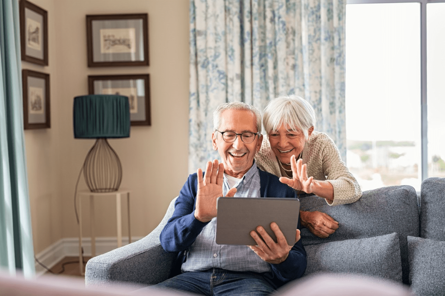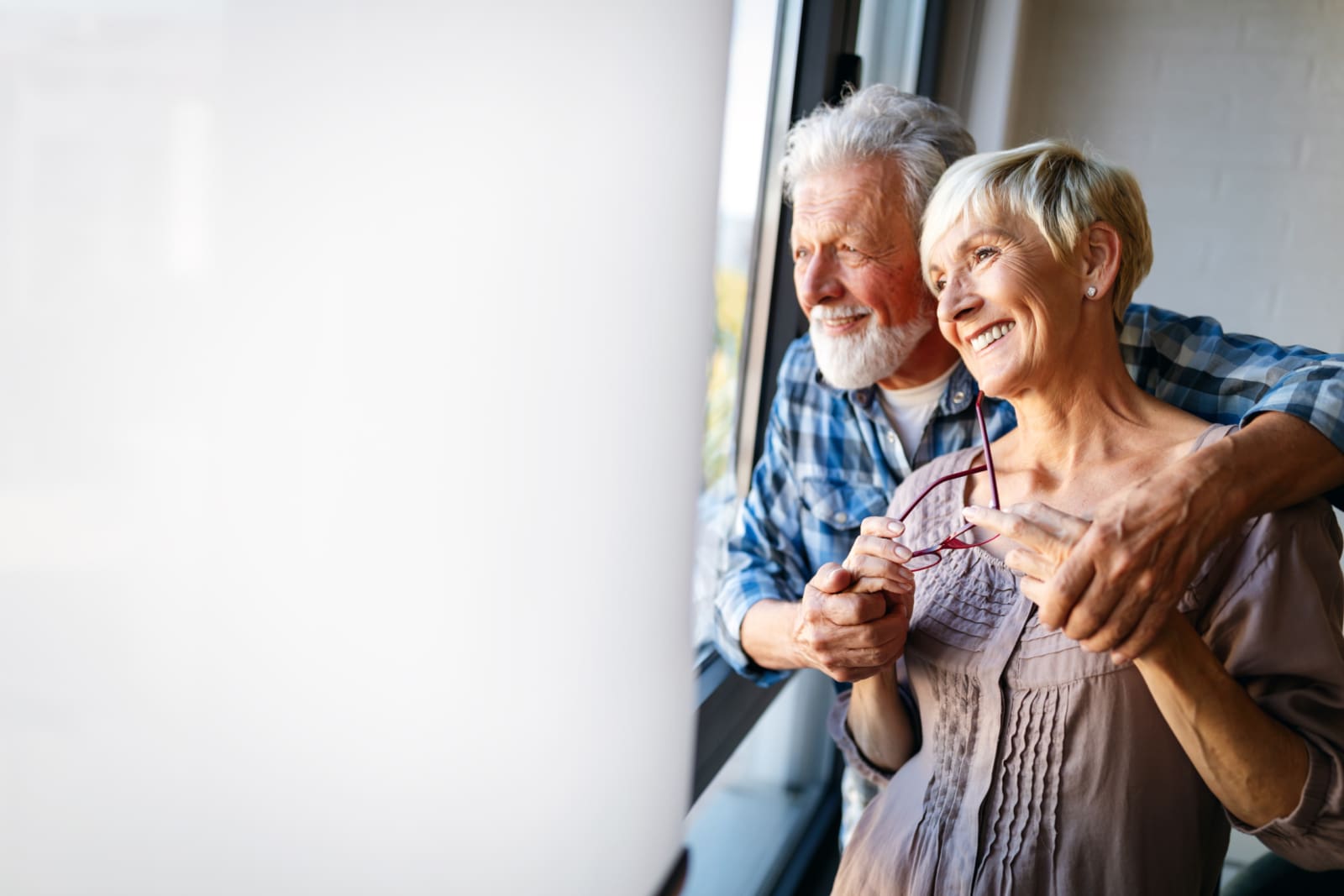 Happy romantic senior couple hugging and enjoying retirement at home