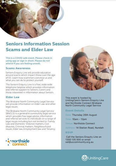 Disclaimer: UnitingCare Seniors Enquiry Line is a not-for-profit information support service and does not share information that is gathered through paid sponsorships or affiliations. The information provided is for general informative purposes only and may not meet all of your specified needs. The enquiry line cannot provide legal or professional advice for the specifics of your matter and has no decision-making power. If you require more specific information, please directly contact relevant service providers or ask the enquiry line for the providers’ contact details if you’re unsure.