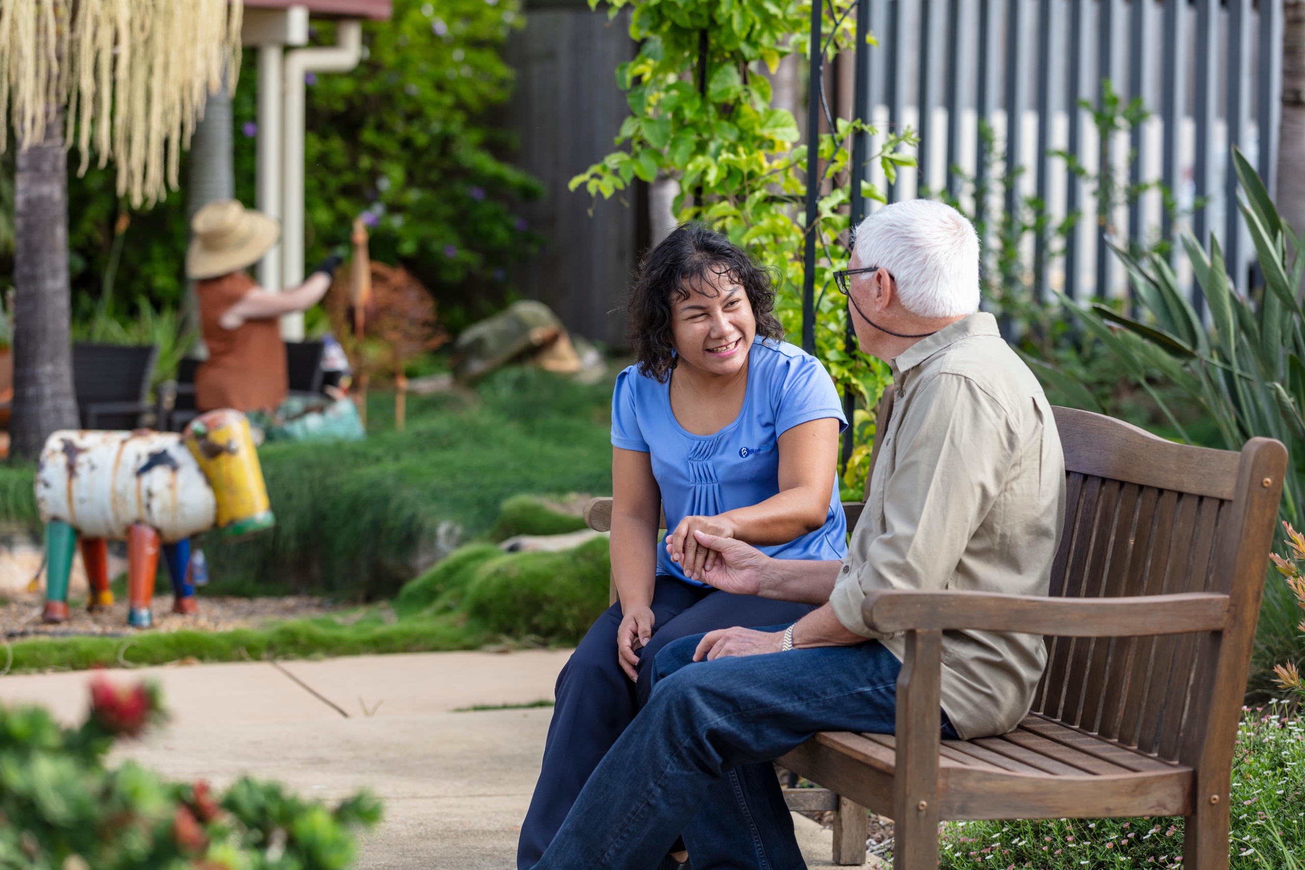 Blue Care RAC Couple in garden with Health Care worker (High res RGB JPEG (No Approval))
